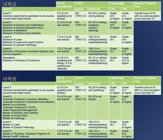 | 애들레이드 플린더스 호주유학을 위해서는 대학입학을 위한 영어능력을 충족해야 하는데요, 제 1언어가 영어가 아닌 경우 아닌 호주유학 입학신청자의 경우는 아래의 조건을 만족해야만 해요. - 아래 이미지 표에 기술된 요건 충족 - 공인 ELICOS 제공자가 제공하는 프리코스 영어 프로그램을 이수 | 영어 능력을 충족하지 못하거나 영어능력 향상을 원하는 호주유학 입학신청자는 공인 영어(ELICOS) 제공자를 통해 영어학습을 할 수 있죠. 즉, 공인 ELICOS 제공자 시설에서 필수 영어수업에 참석하는 IELTS 또는 TOEFL 시험을 보지 않고도 필요한 레벨에 도달하면 호주 플린더스 대학에 직접 입학 할 수 있는 자격이 주어지게 됩니다. |